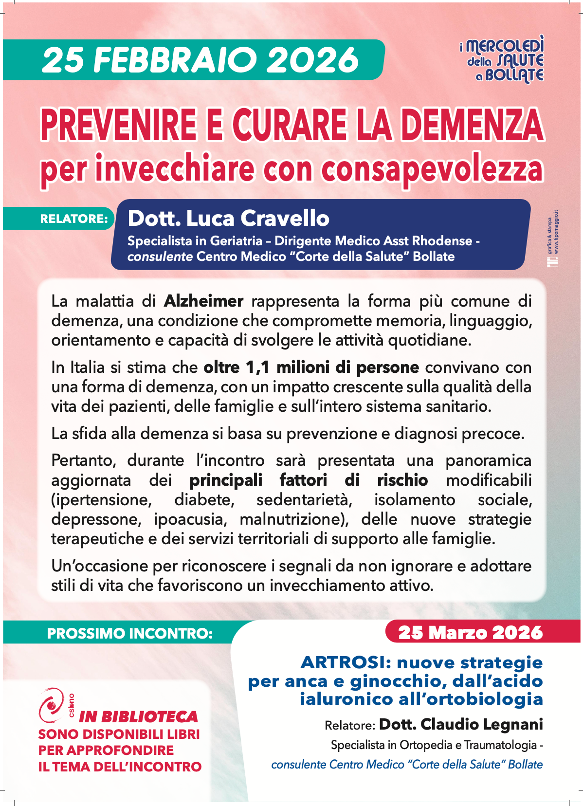Il Dott. Luca Cravello Specialista in Geriatria – Dirigente Medico Asst Rhodense -Consulente Centro Medico Polispecialistico “Corte della Salute”- Bollate, durante l’incontro presenterà una panoramica aggiornata dei principali fattori di rischio modificabili per la demenza (ipertensione, diabete, sedentarietà, isolamento sociale, depressione, ipoacusia, malnutrizione), delle nuove strategie terapeutiche e dei servizi territoriali di supporto alle famiglie.