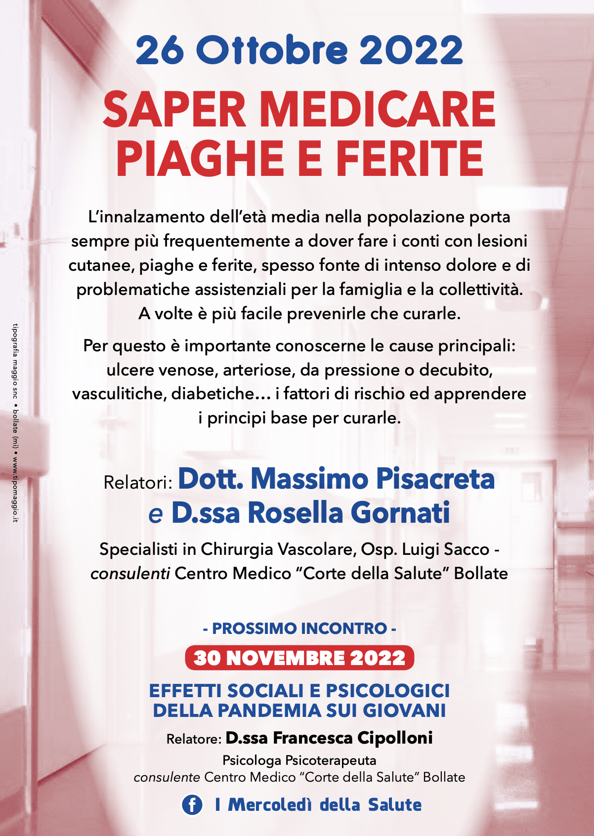 I relatori Dott. Massimo Pisacreta e la D.ssa Rossella Gornati, specialista in chirurgia vascolare, Osp.Luigi Sacco e consulenti del Centro Medico "Corte della Salute" Bollate hanno affrontato il tema SAPER MEDICARE PIAGHE E FERITE . L'innalzamento dell'età media nella popolazione porta sempre più frequentemente a dover fare i conti con lesioni cutanee, piaghe e ferite, spesso fonte di intenso dolore e di problematiche assistenziali per la famiglia e la collettività. A volte è più facile prevenirle che curarle. Per questo è importante conoscerne le cause principali: ulcere venose, arteriose, da pressione o decubito, vasculitiche, diabetiche..., i fattori di rischio ed apprendere i principi base per curarle.
