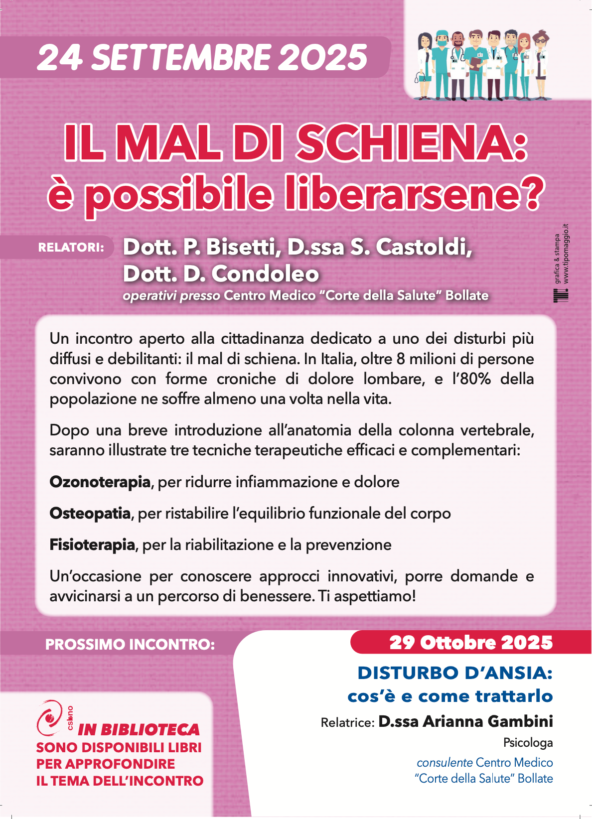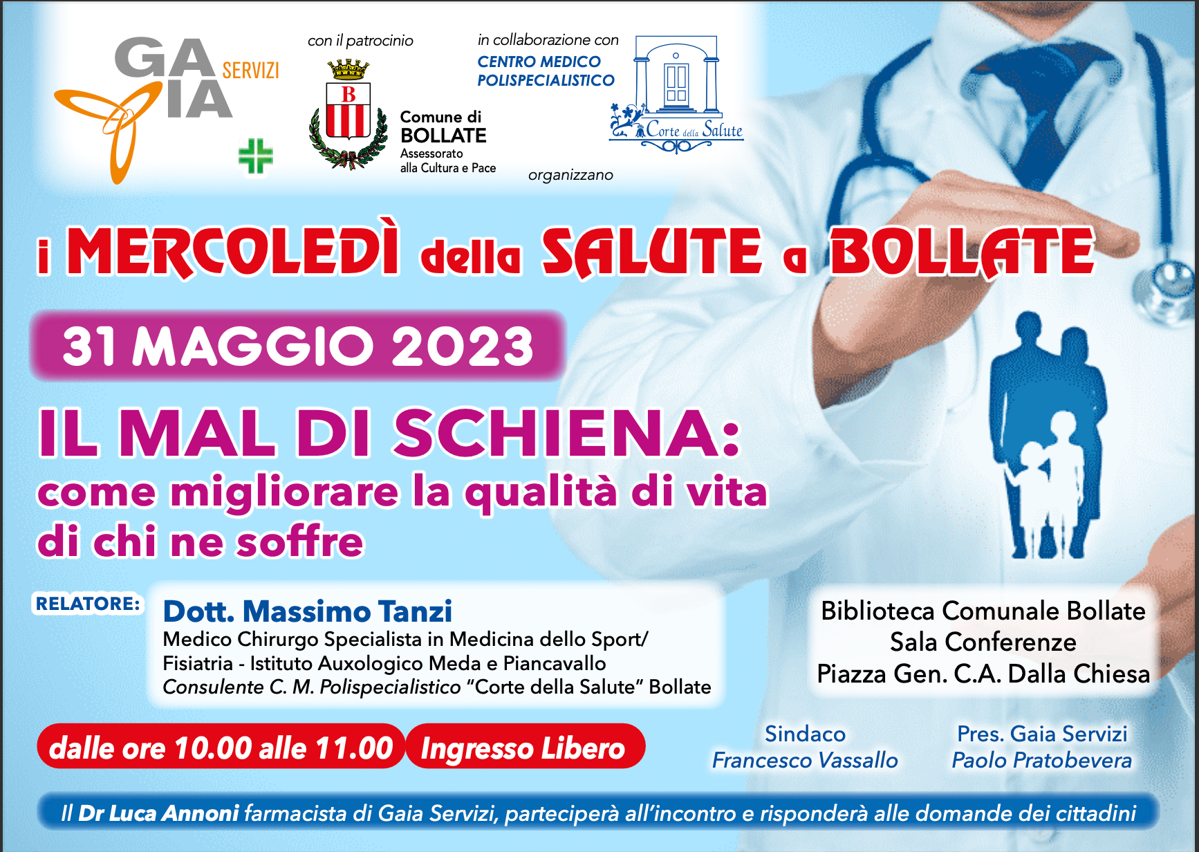 L’incontro, dal titolo “Il mal di schiena: come liberarsene”, ha visto la partecipazione di tre professionisti, consulenti del Centro Medico Corte della Salute, che hanno offerto ai presenti una panoramica completa e multidisciplinare delle possibilità terapeutiche
