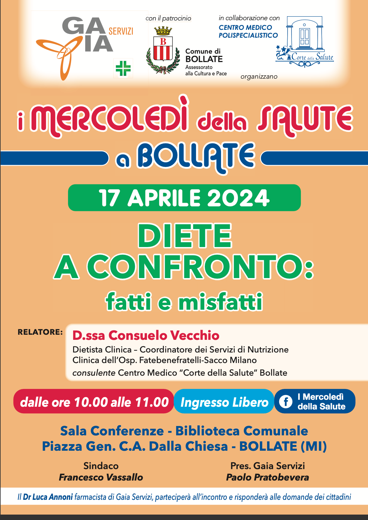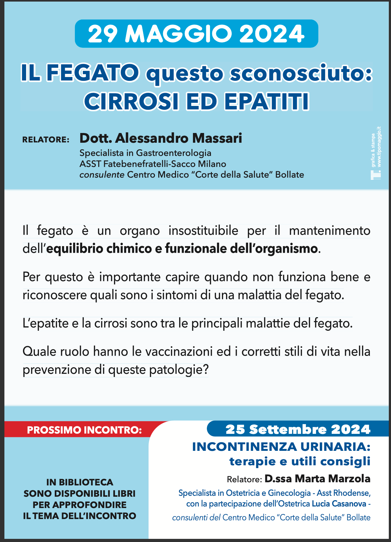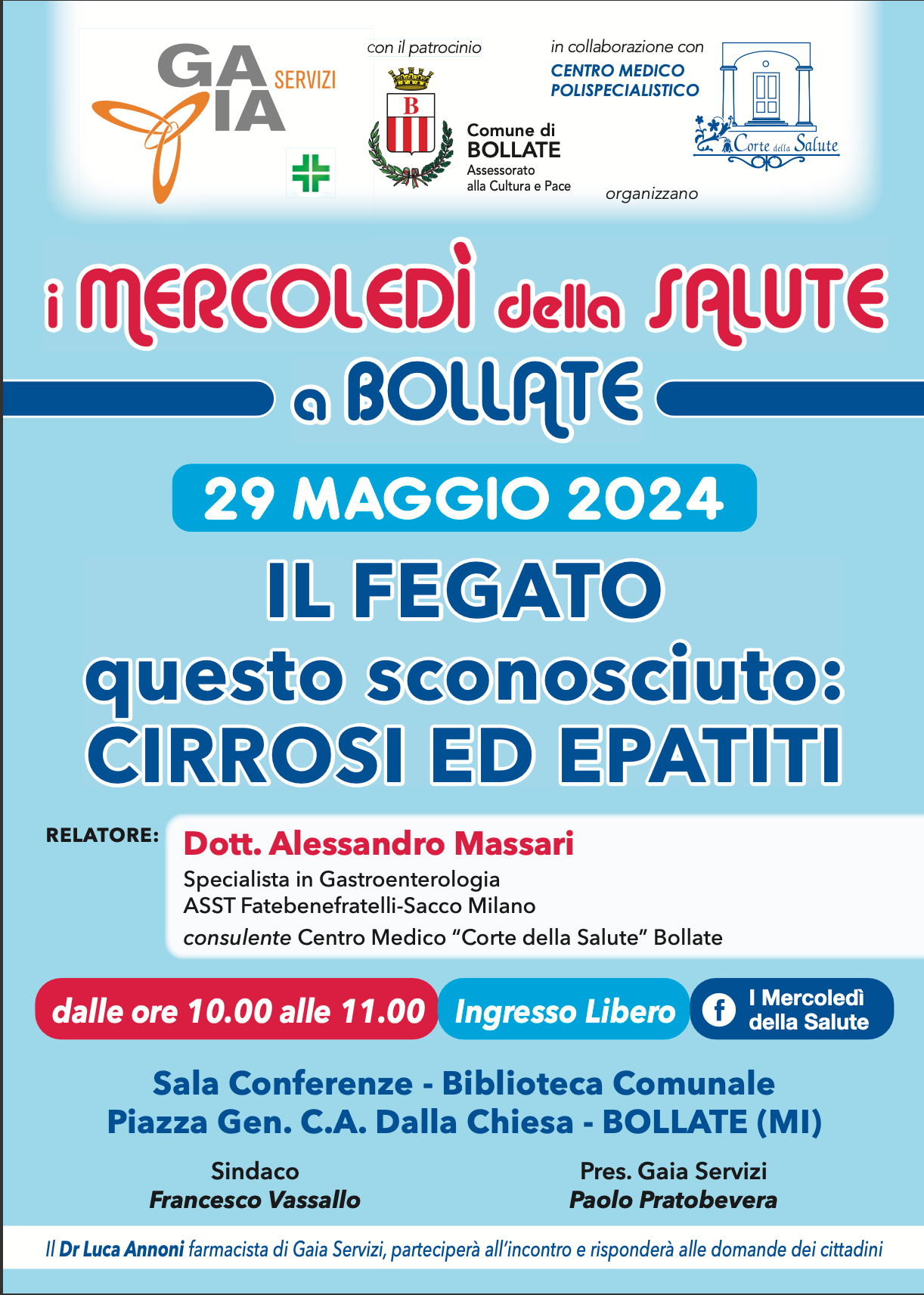 Vi aspettiamo mercoledì 28 settembre alle ore 10.00 in Biblioteca Comunale, nella Sala Conferenze, a Bollate in piazza C.A. Dalla Chiesa, per parlare insieme di GASTRITE E GASTROPROTETTORI con il dott. ALESSANDRO MASSARI, specialista in Gastroenterologia dell'Ospedale Luigi Sacco e consulente del Centro Medico " Corte della Salute" di Bollate.