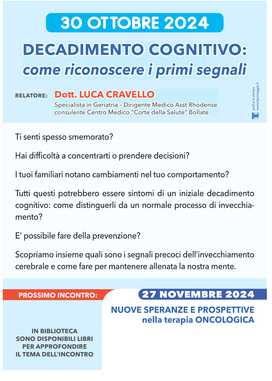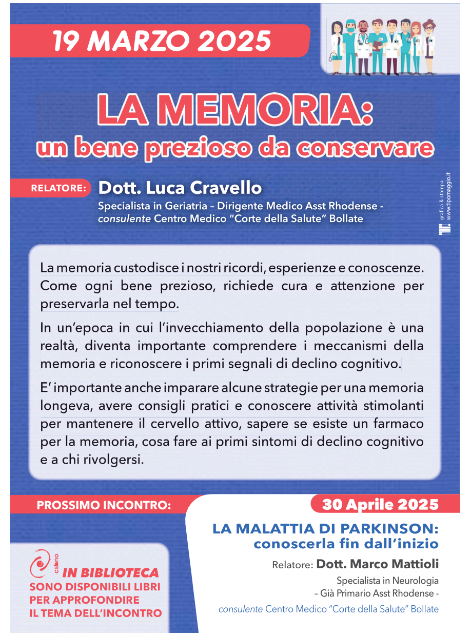 Come ogni bene prezioso, richiede cura e attenzione per preservarne l'integrità nel tempo. In un'epoca in cui l'invecchiamento della popolazione è una realtà, diventa cruciale comprendere i meccanismi della memoria, imparare a mantenerla attiva e riconoscere i primi segnali di declino cognitivo. Il complesso tema della memoria è stato affrontato mercoledì 19 marzo dal dottor Luca Cravello, Medico Specialista in Geriatria e dirigente medico del Centro per i Disturbi cognitivi e le Demenze dell’ASST Rhodense, consulente presso il Centro Medico “Corte della Salute” a Bollate.