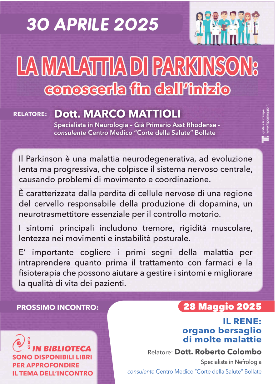 Mercoledì 30 aprile, alle ore 10 in Biblioteca a Bollate si è tenuta la conferenza sulla malattia di Parkinson. Erano presenti due Specialisti d’eccezione: il dott. FRANCO GRASSI, Presidente ASPI (Associazione Parkinson Insubria) e il dott. MARCO MATTIOLI Specialista in Neurologia, già Primario Asst Rhodense-Consulente del Centro Medico Polispecialistico “Corte della Salute” - Bollate.