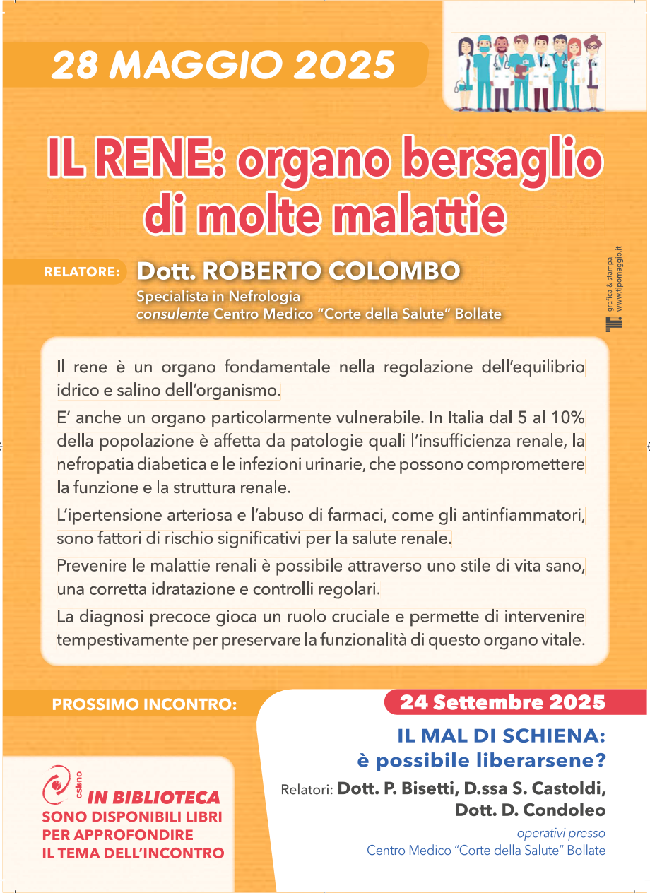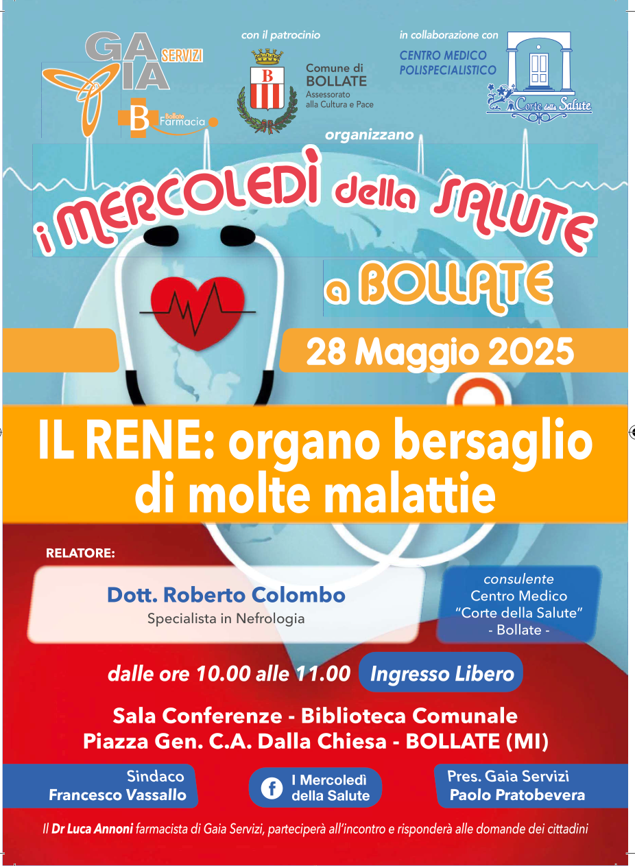 Mercoledi 28 maggio, in biblioteca a Bollate alle ore 10 si è tenuto l’ultimo incontro dei Mercoledì della Salute prima della pausa estiva. Questa volta si è parlato di RENE, organo bersaglio di molte malattie. Grazie alla disponibilità del dott. Roberto Colombo, Specialista in Nefrologia - già operatore presso la Nefrologia dell'ospedale di Rho e Consulente Centro Medico Polispecialistico “Corte della Salute” – Bollate, è stato approfondito il tema della salute renale che in tutti questi anni non avevamo mai trattato. LE MALATTIE RENALI SONO IN CRESCITA in tutto il mondo ed hanno un grande impatto sociale. Dato l’aumento dell’età della popolazione generale e delle patologie ad essa correlate come il diabete e l’ipertensione arteriosa, si calcola che in Italia dal 5 al 10% della popolazione ne sia affetta e che questa percentuale sia destinata ad aumentare nel tempo.