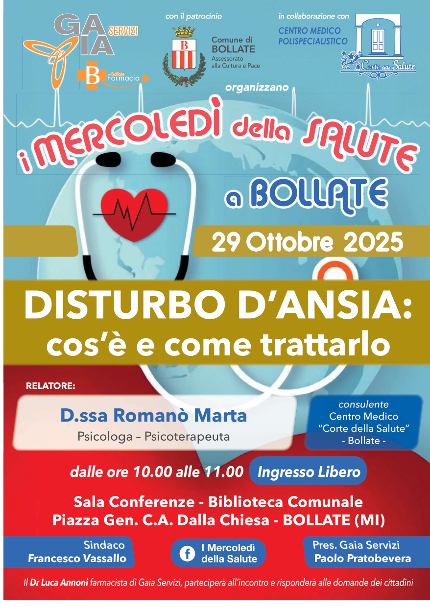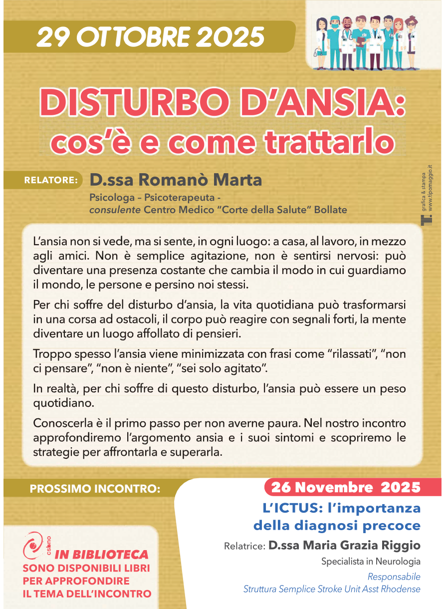 La Dssa Romanò Marta, Psicologa – Psicoterapeuta - Consulente Centro Medico “Corte della Salute” - Bollate, ci ha aiutato a scoprire le strategie per affrontare il disturbo d'ansia. È stata un’occasione preziosa per informarsi e capire che chiedere aiuto non è un segno di debolezza ma di forza e consapevolezza.