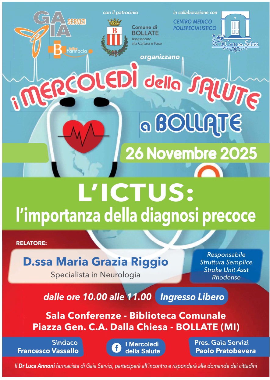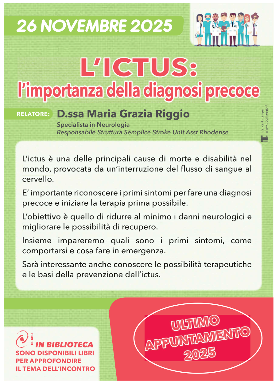 Mercoledì 26 novembre 2025 alle ore 10.00 in Biblioteca Comunale si è parlato di ICTUS CEREBRALE e dell'importanza della sua diagnosi precoce.